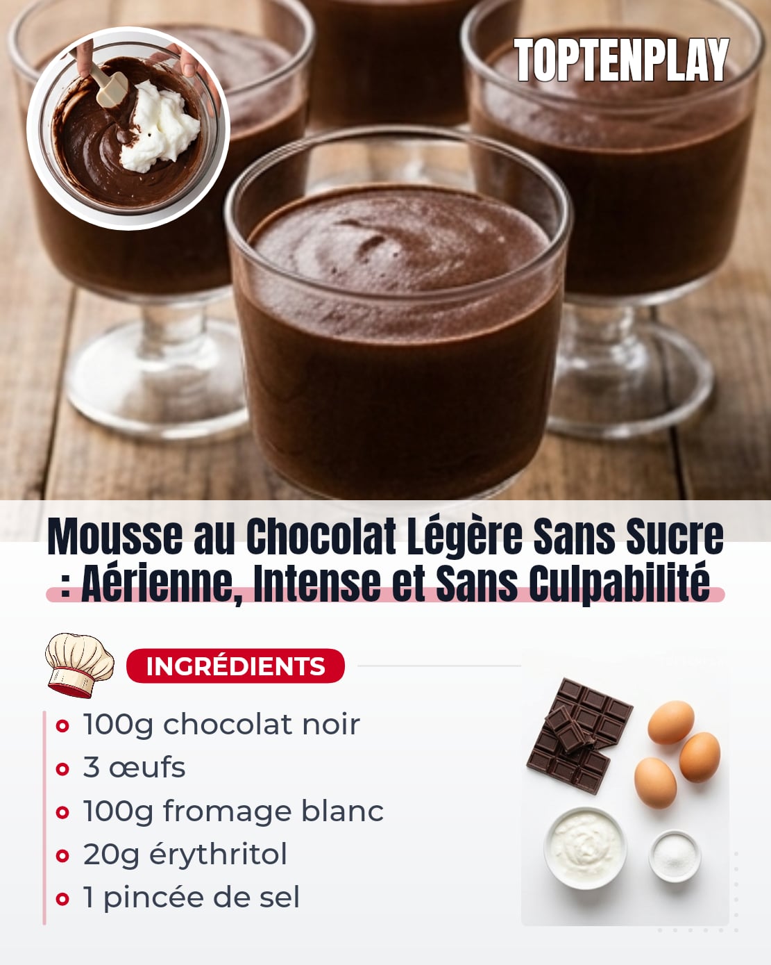 La mousse au chocolat allégée a mauvaise réputation — souvent à juste titre. On vous promet du gourmand, on vous livre du spongieux avec un arrière-goût chimique qui traîne. Mais quand elle est bien faite, cette version sans sucre est franchement meilleure que beaucoup de mousses classiques.