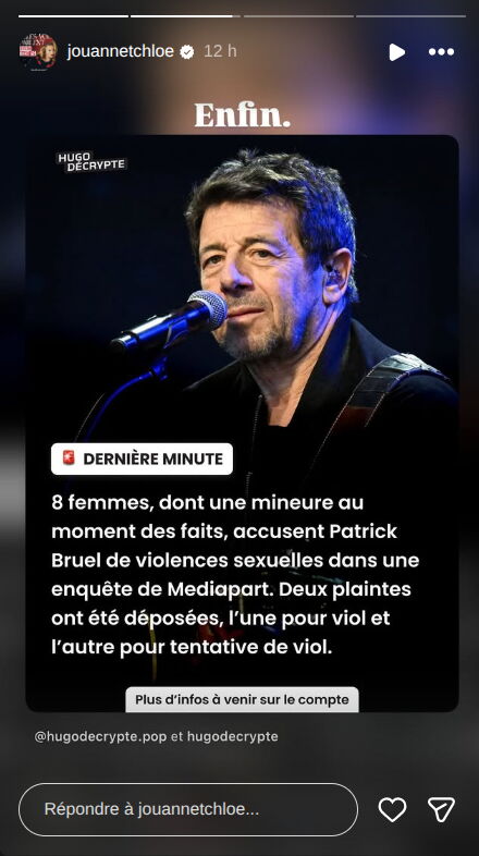Malgré les dénégations de Patrick Bruel, les dernières révélations à son sujet ont fait couler beaucoup d’encre sur les réseaux sociaux. Chloé Jouannet, fille d’Alexandra Lamy et Thomas Jouannet, a notamment relayé l’article de Mediapart dans sa story Instagram avec le commentaire suivant : “Enfin”. Et quelques heures plus tard, c’est sa célèbre mère qui a réagi.
