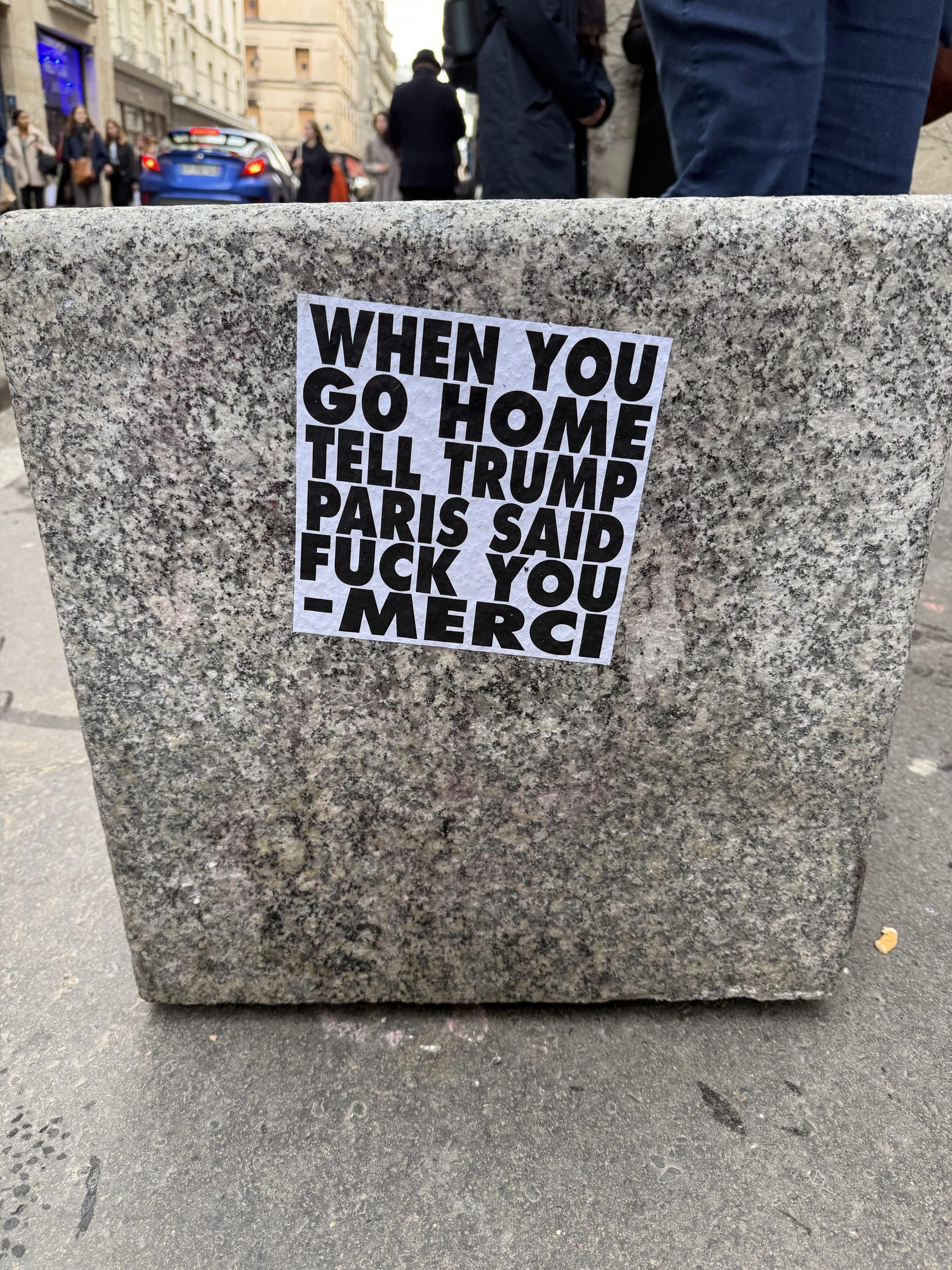 Dans une rue animée de Paris, une simple affiche collée sur un bloc de pierre attire l’attention des passants. En lettres noires, un message direct et provocateur s’adresse à Donald Trump, reflétant une expression brute et sans filtre.